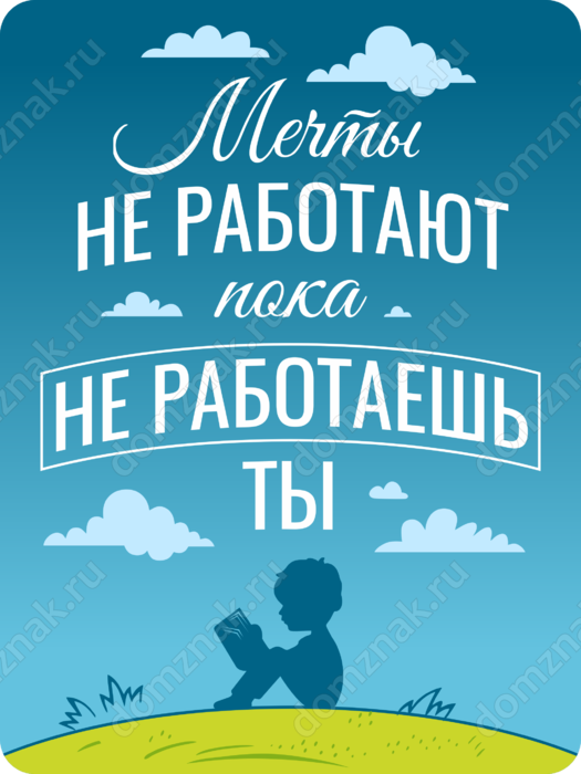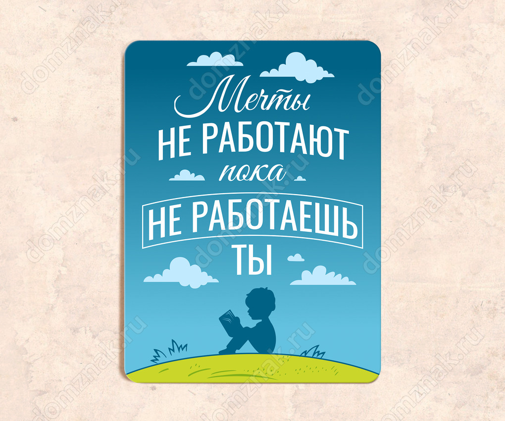 Табличка «Мечты не работают пока не работаешь ты» изготовлена из пластика ПВХ, толщиной 4 мм. Изображение наносится по технологии УФ-печати. Табличка предназначена для использования как в помещении, так и на улице.
