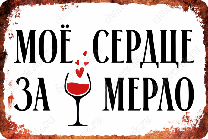 Табличка «Мое сердце за мерло» изготовлена из пластика ПВХ, толщиной 4 мм. Изображение наносится по технологии УФ-печати. Табличка предназначена для использования как в помещении, так и на улице.
